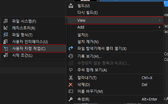 Visual Studio Installer 프로젝트에서 우클릭하여 View → 사용자 지정 작업을 선택한다.