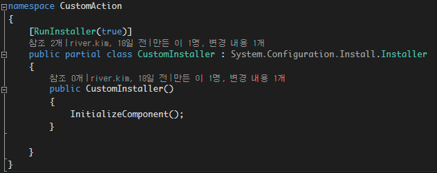 추가된 CustomInstaller.cs 클래스의 코드 보기를 한다면 아래와 같은 화면이 보일 것이다.